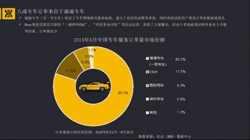 近日,中國IT研究中心(CNIT)正式發(fā)布《2015年中國移動出行應(yīng)用市場研究報告》。據(jù)報告顯示,截止到2015年6月,滴滴專車(含一號專車)占據(jù)中國專車服務(wù)訂單量市場份額的80.2%。,第二名Uber的服務(wù)訂單量占市場份額的11.5%。